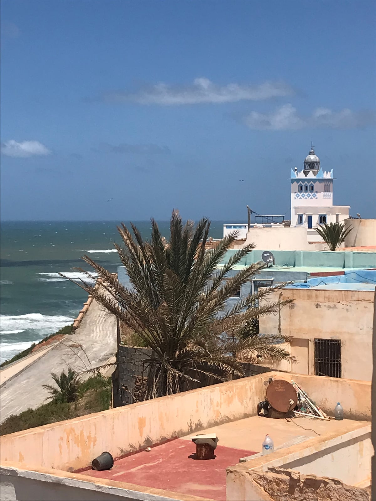 Comfortable 2nd floor apartment overlooking the iconic art-deco lighthouse in Sidi Ifni. In a modern block and equipped to a high standard, this is a bright and airy space with a large enclosed balcony. The kitchen is well-equipped and bedlinen + towels are provided. Sidi Ifni is a small, charming resort 2 hours south of Agadir airport - we can provide transfers and will be on-call during your stay.