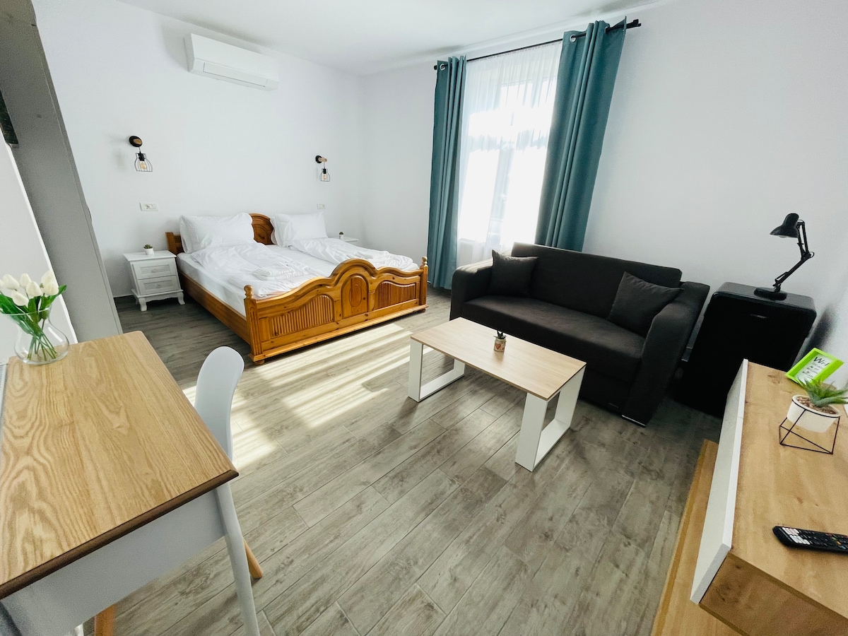 Dos elegantes apartamentos en una casa histórica de 300 años - Centro de Sighișoara. Cada uno de los 2 amplios apartamentos ofrece alojamiento para 4 personas, con salón, cocina, terraza privada y acceso al jardín. Ofrecemos aparcamiento seguro en el interior, detrás de puertas cerradas Disfruta de una estancia tranquila y auténtica en el corazón de la historia de la ciudad.