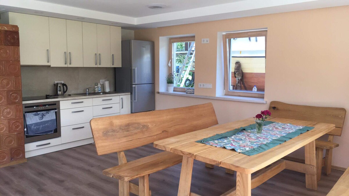 New EV friendly spacious apartment with a terrace equipped to meet the needs of an independent holidaymaker. The house has all to make you feel at home including a comfortable kitchen, floor heating, AC, shower and WC facilities, bedroom + loft for adults and children, comfortable mattresses. The house provides 6 sleeping places: 2 double beds and sofa-bed. Baby crib, dog pillow bed, workation set, Type2 EV cable available upon request.