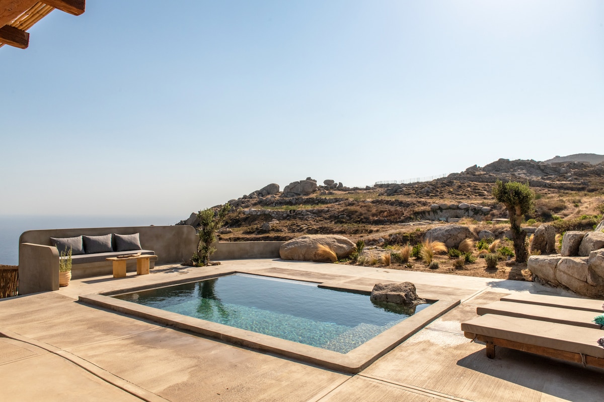 Escápate a tu casa exótica privada donde puedes disfrutar de la tranquilidad de las montañas, con el impresionante paisaje que recuerda a una imagen galáctica, ya que está rodeado de "piedras lunares" y consistente con la vista serena del hermoso mar Egeo. Con las ovejas y la casa Lunar como tus vecinos más cercanos, ¡disfrutarás de un completo aislamiento en este entorno tranquilo y tranquilo!