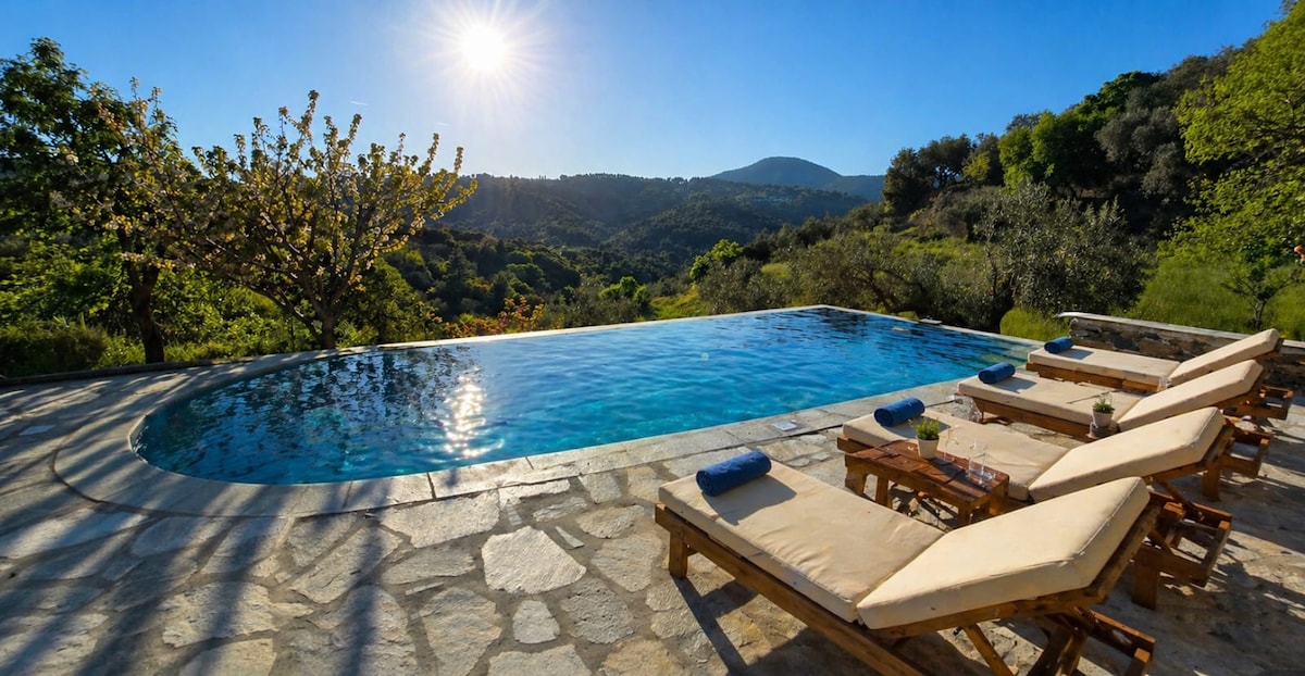 Villa Aelia by Kardous Villas is a luxury private villa in Skopelos, set within its own olive grove and designed for privacy and relaxation. The villa features 4 en-suite bedrooms, a fully equipped kitchen, and comfortable living areas. Guests enjoy a 12-meter infinity pool, spacious terraces, and pergolas offering sun or shade throughout the day. A gas BBQ is available for outdoor dining. Fully air-conditioned, with daily housekeeping included, and located close to beautiful beaches