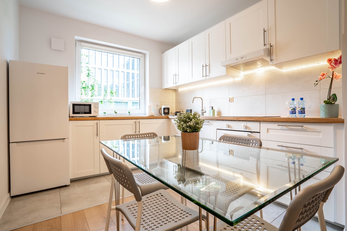Elegante apartamento en el centro de Breslavia. Dos camas de matrimonio, TV, wifi, HBO Max, aire acondicionado; baño con ducha y secador de pelo, toallas. Cocina con placa de inducción, lavavajillas, lavadora-secadora, microondas y cafetera. Equipado con los platos y cubiertos necesarios. En el pasillo hay un armario con percha y cajones, plancha y tabla de planchar.