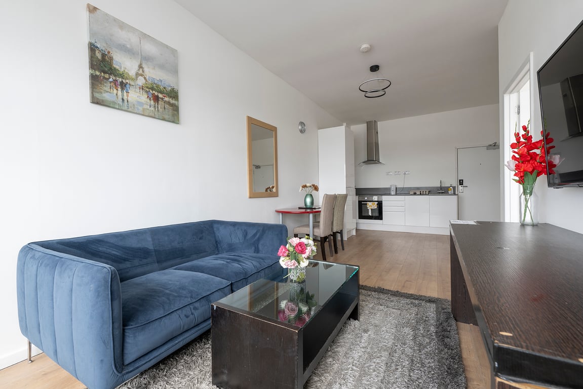 A stylish modern studio! Open to contractors, friends, and families. Super king size bed for extra comfort and fitted wardrobe with plenty of space & bespoke handmade furniture. High-speed WiFi and a cozy living room with a 65’’ Smart LG TV. Fully equipped kitchen with cutlery and glassware Located close to local amenities High level of security for your peace of mind. Composite grade front door with 4K Hikvision CCTV cameras all around the building. Video doorbell with 2-way intercom.