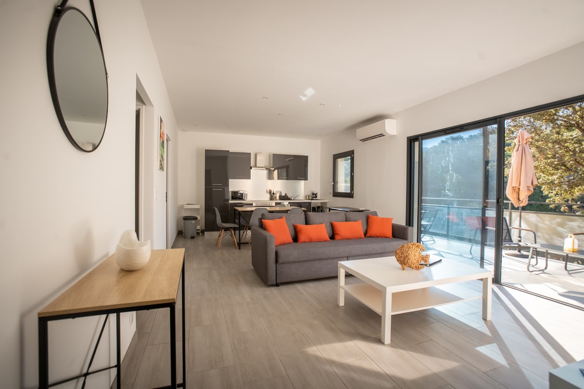 Alojamiento de tipo F2 nuevo, en la parte inferior de la villa con vistas al mar. Cocina equipada, baño con ducha italiana, dormitorio con cama de 160, sala de estar con sofá cama, despensa con lavadora, secadora y congelador. El apartamento tiene una gran terraza con barbacoa y vistas al mar. Cerca de todos los servicios, a 150 metros del supermercado casino, y a 2 minutos de las playas y del centro de la ciudad.