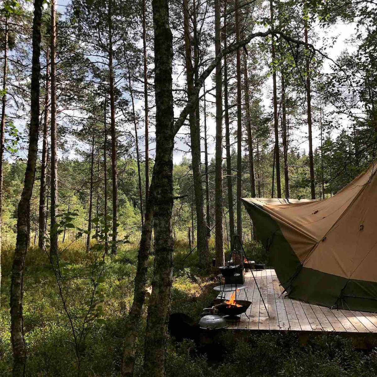 Duerme con los sonidos del canto de los pájaros después de una caminata de un día en el parque nacional de Tyresta. Experimenta la niebla colgante baja sobre el pantano a través de los pinetos. Luego, después de una noche de sueño en la carpa glamping, deje que los rayos tentativos del sol y los aromas de la vegetación lo despierten lentamente. Aquí, en Höjden Glamping, usted combina su experiencia al aire libre con camas listas para usar, cómodos sillones reclinables y una cesta de desayuno entregada a la tienda por la mañana.
