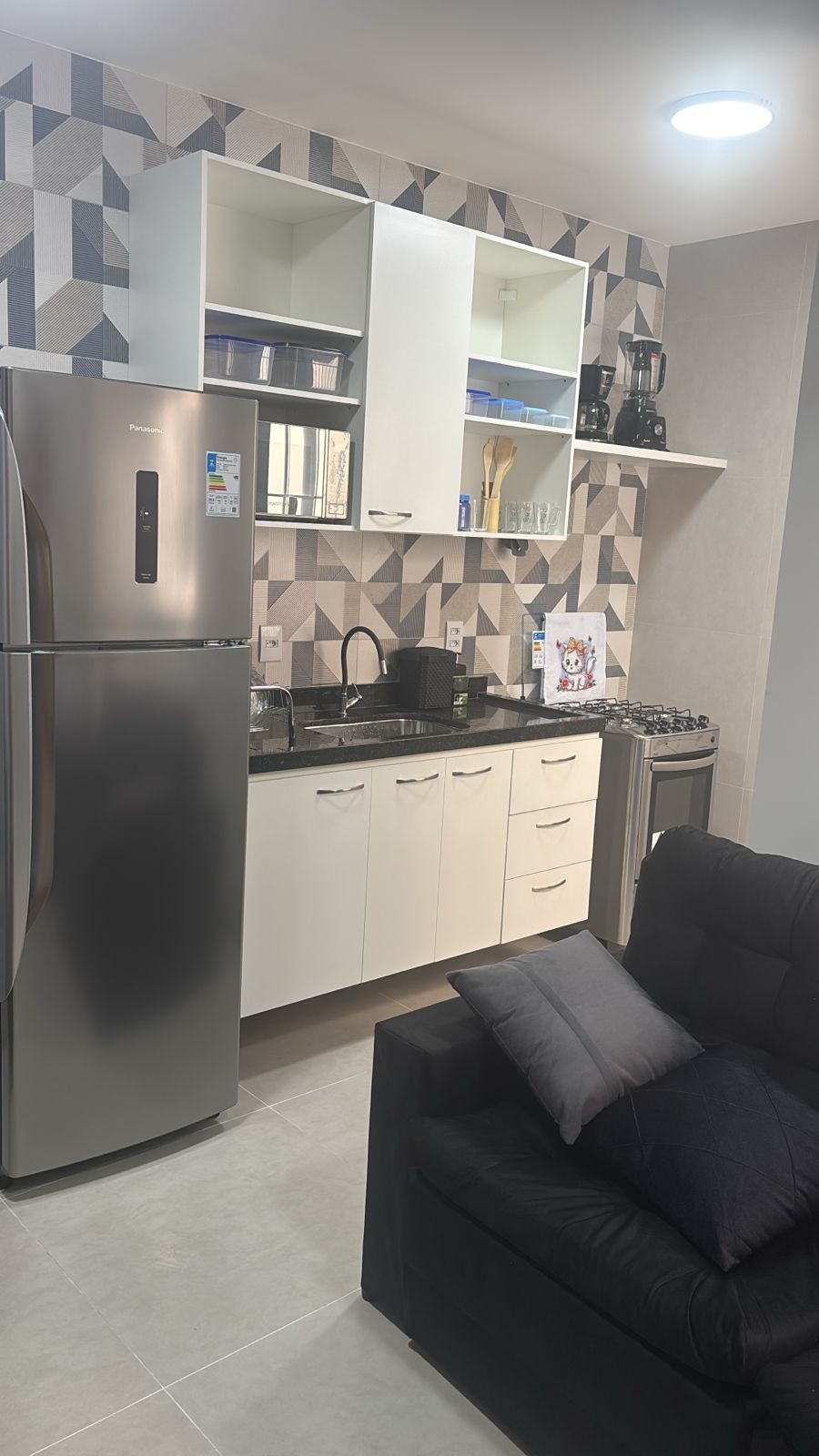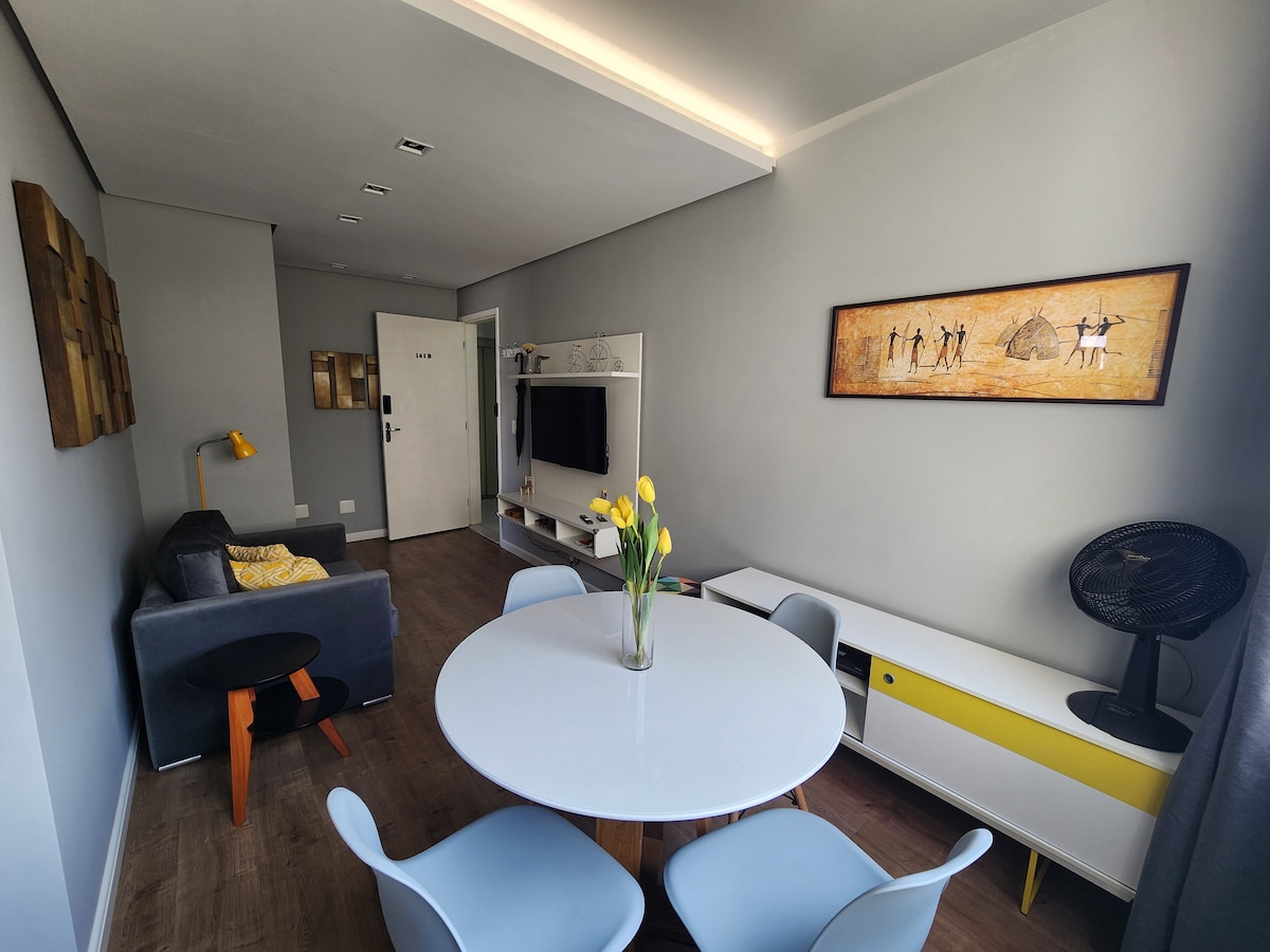Estudio moderno completo con vaga, TV de 75" y wifi