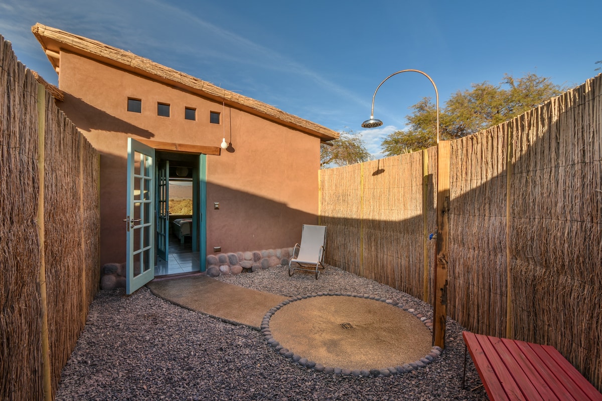 Cabaña privada alejada del centro turistico, a 3,5 kms Estilo autóctono de San Pedro de Atacama (Adobe), donde la vista descansa en lo verde y tranquilidad del oasis. Private Hütte 3,5 km entfernt vom touristischen Zentrum. Im einheimischen Baustil der San Pedro Kultur ( in Adobe), im Grünen und der Ruhe der Oase. Private cabin away from the tourist center, 3.5 kms Native style of San Pedro de Atacama (Adobe), where the view rests in the green and tranquility of the oasis. 100% sun energy