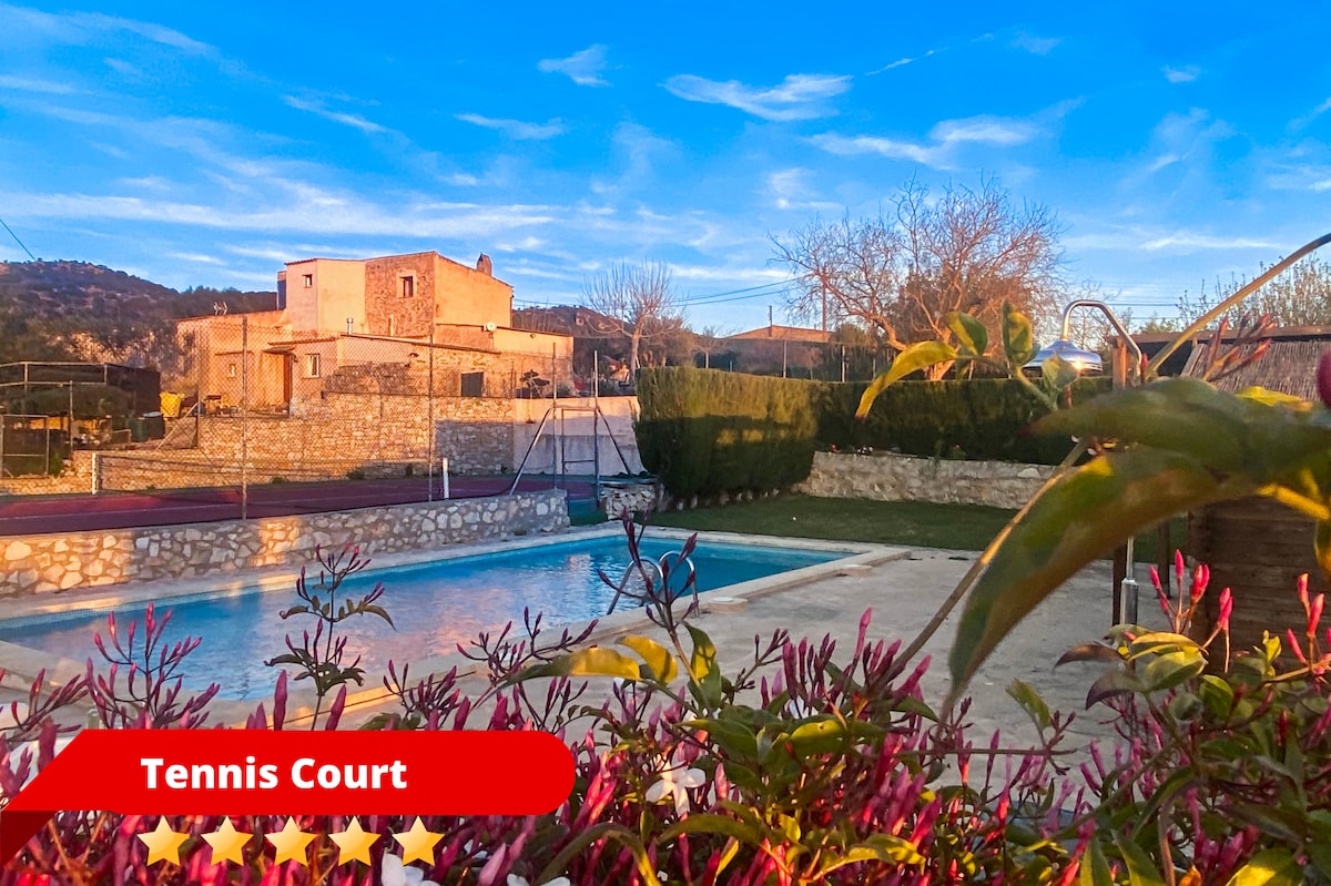 Casa mallorquina de más de cien años de antiguedad.Tiene planta baja y piso,en la planta baja tiene un dormitorio un baño,sala de estar y cocina comedor.En la planta superior hay dos habitaciones un baño una sala de estar y una terraza. La cocina tiene salida a un terraza cubierta seguida de terraza descubierta donde hay una enorme encina que da una sombra estupenda,a continuacion esta la piscina con terraza y una zona con cesped.
