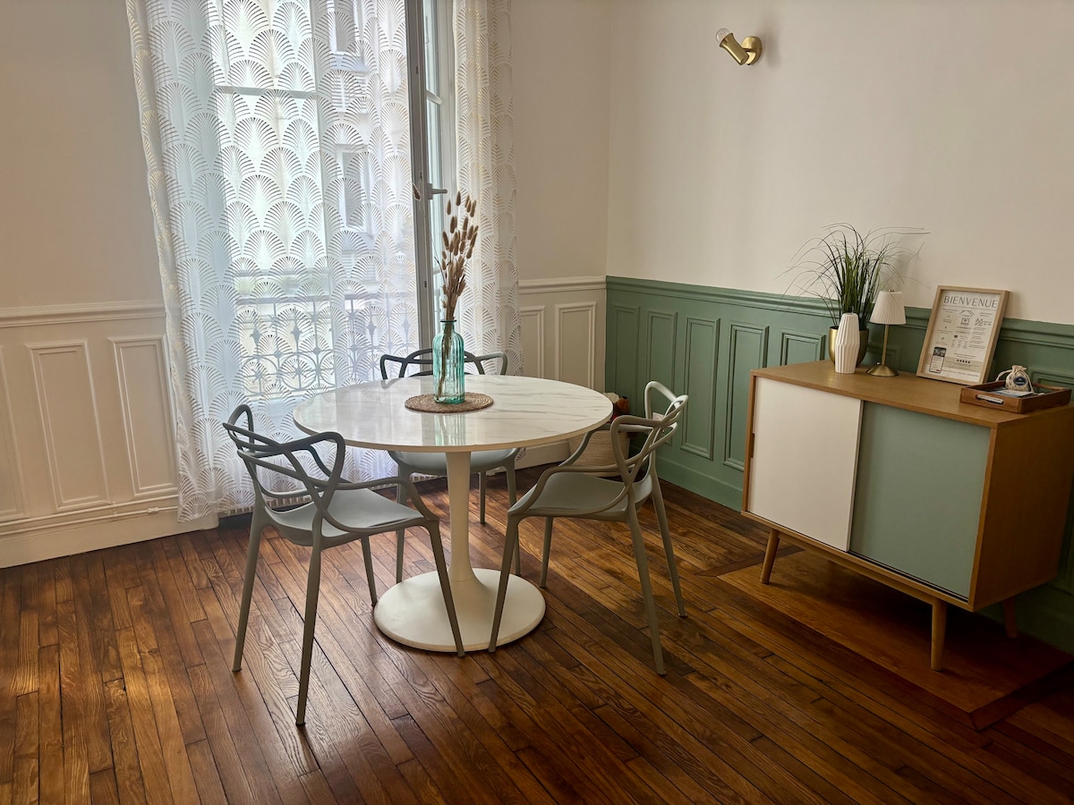 🌟 Bienvenido a su nido parisino de alta gama en Nation Sumérjase en la elegancia de un apartamento típicamente parisino, completamente renovado, que combina el encanto de lo antiguo (parqué macizo, molduras, techos altos) y el confort moderno. Ideal para una estancia en familia, con amigos o en pareja, este alojamiento combina tranquilidad, refinamiento y ubicación céntrica.