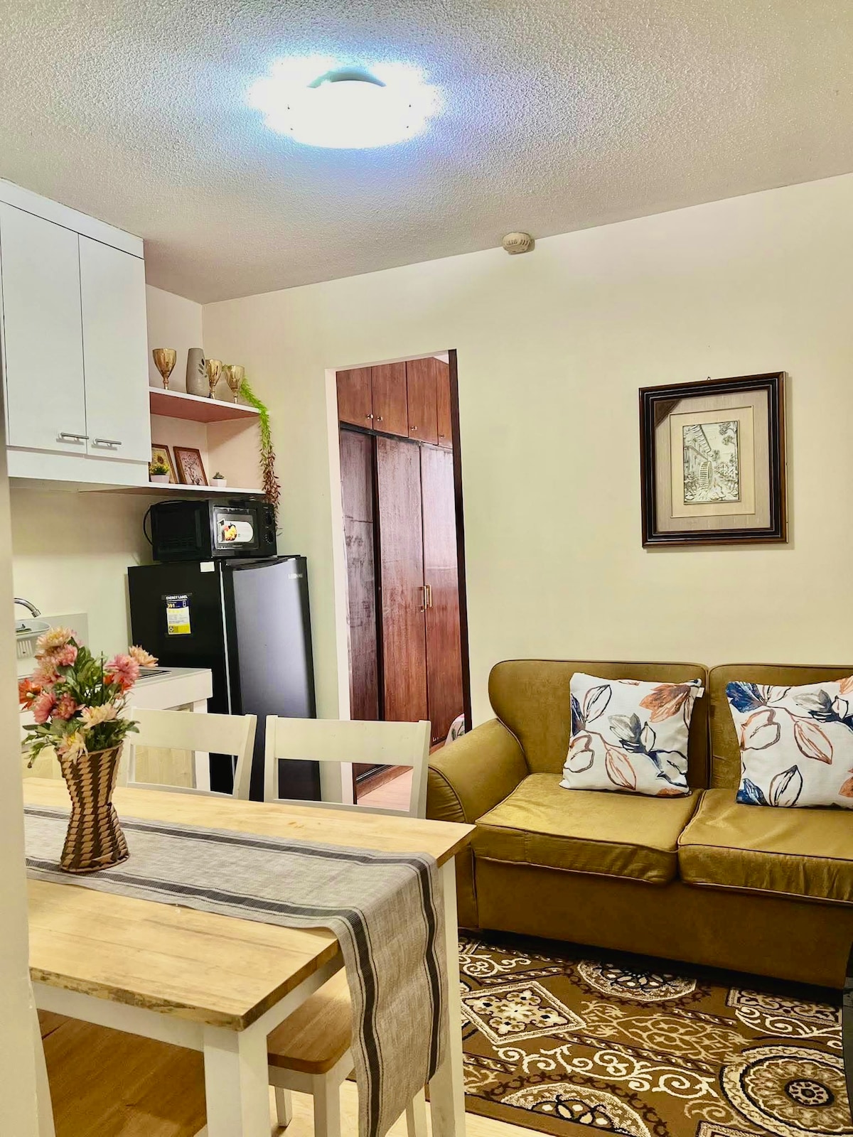 Este es nuestro humilde estudio con capacidad para 3-4 personas. Tenemos una cama de tamaño doble con una cama individual extraíble. También tenemos un sofá cama para 1 persona. Ofrecemos internet de alta velocidad. Tenemos instalaciones de cocina como cocina de inducción, hervidor de agua, etc. Tenemos TV de 43 pulgadas con Google Chrome con NETFLIX, Premium Youtube y Primevideo Tarifas de la piscina: incluidas sin cargos adicionales Puedes disfrutar de una piscina olímpica, una piscina tipo resort y una piscina para niños. El estacionamiento es con pago (P250) y debe arreglarse con anticipación.