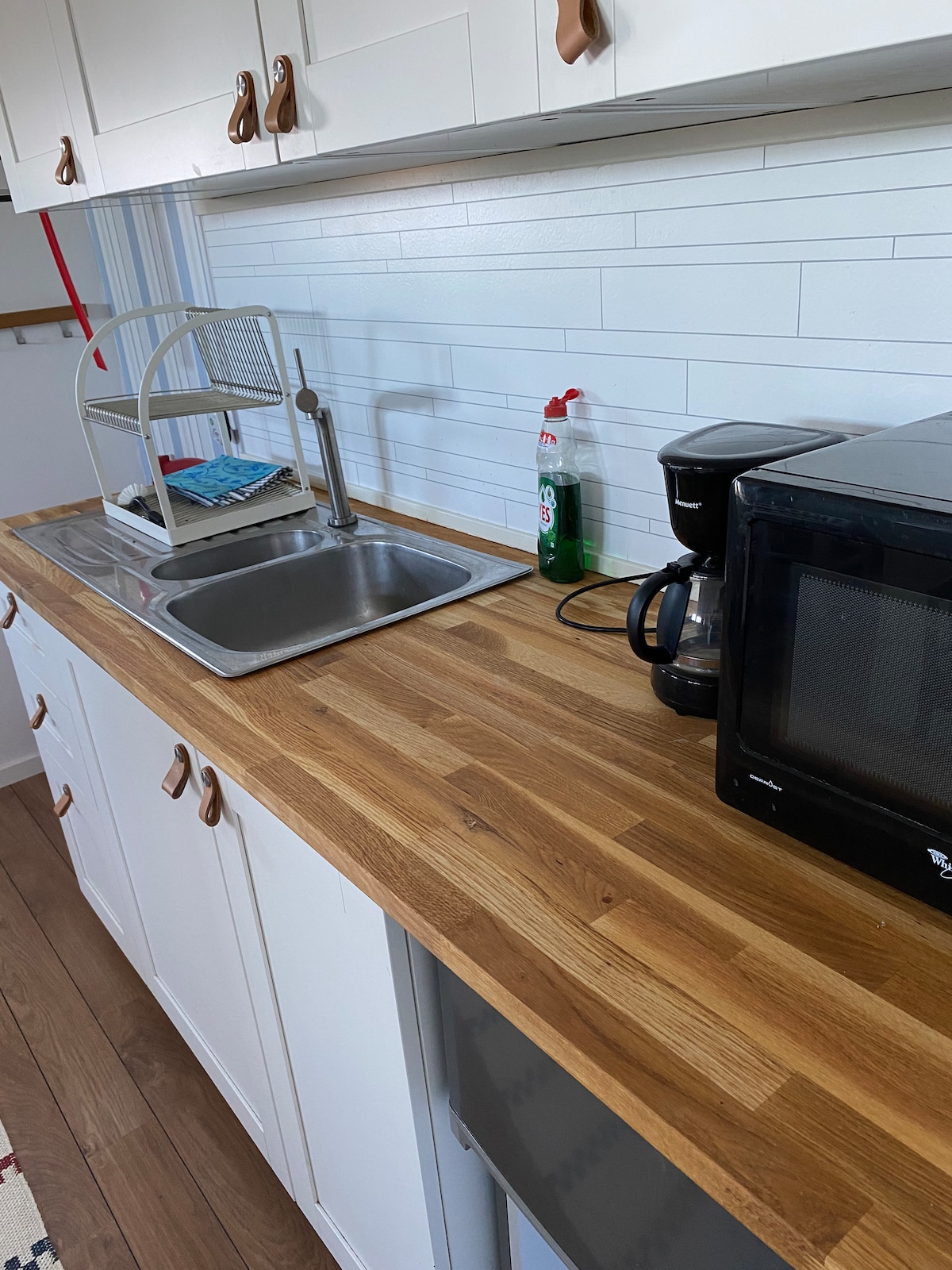 Apartamento pequeño pero bien planeado perfecto para dos personas. Solo una habitación, pero está dividida en dos partes. Uno con una gran cama de 140 cm de ancho, un televisor inteligente y algunos trasteros y lámparas de lectura. La otra parte es una cocina con una pequeña placa de inducción, un café, un hervidor de agua, una nevera y un lavabo. Todo para cocinar normalmente, como cubiertos, sartenes y ollas, platos, cuchillos, vidrio de todo tipo, etc. Yoy también puede usar un gran frigorífico hecho para uso al aire libre en tu balcón. Baño grande con inodoro, ducha.