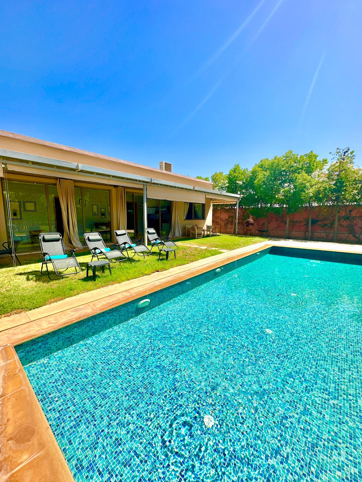 Villa située à 30 minutes de Gueliz dans un charmant domaine sécurisé 24/7 avec terrain de tennis commun et piscine privée. La villa se compose de 3 tres grandes suites avec chacune leur cheminée, leur télé (Netflix gratuit), 3 salles de bain, d'une petite piscine intérieure chauffée, d'une piscine extérieure privative et d'un jardin privatif sans vis à vis, d'un salon avec cheminée. Table à manger convertible en billard et en table de ping-pong. Idéal pour se détendre au calme.
