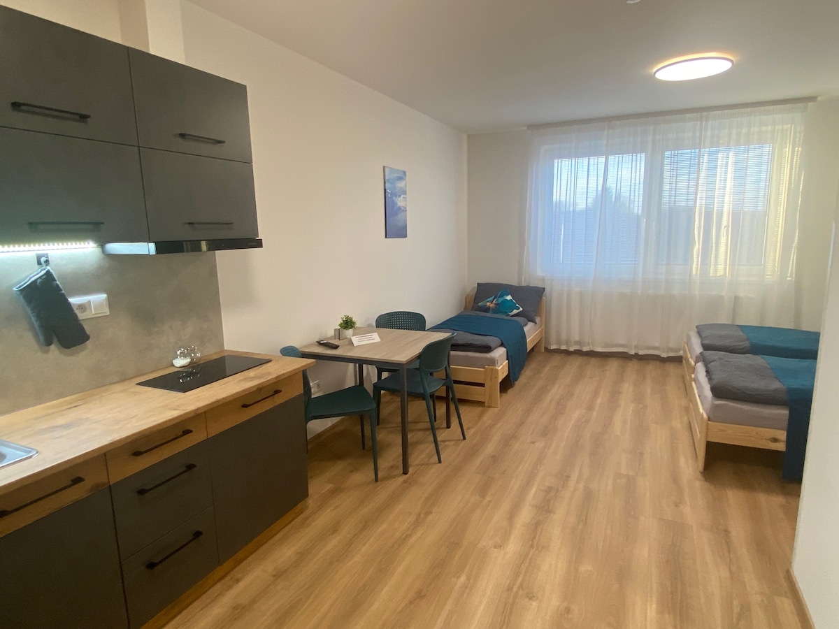 Alojamiento único con una gran cocina, bar de vinos y asientos al aire libre en una zona tranquila de la ciudad, rodeado de naturaleza. El departamento se encuentra a 10 minutos del centro de la ciudad. Justo enfrente del apartamento hay un restaurante Pilsen. La tienda está a 5 minutos a pie. Hay aparcamiento gratuito a 100 metros del apartamento, debajo del pub. En el apartamento es posible hacer un sofá cama para niños, etc. Posibilidad de utilizar el cargador de coches eléctricos. Esperamos recibirte. Linda y Vojta.