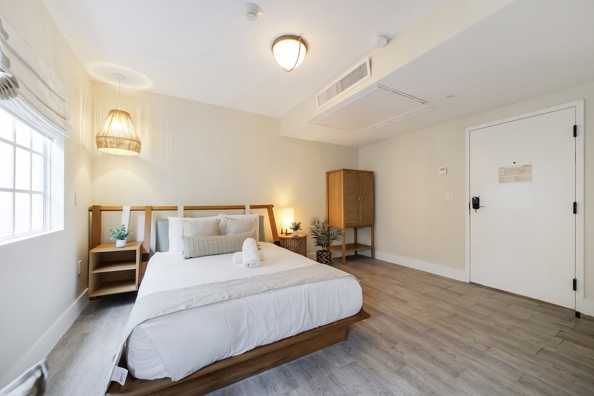 Disfrute del lujo refinado en esta suite recién renovada en South Beach, a solo una manzana del océano. Perfecta para el ocio o los negocios, cuenta con una lujosa cama tamaño king (dos camas individuales), wifi de alta velocidad, Smart TV y un espacio de trabajo dedicado. Los detalles incluyen un armario con perchas, plancha y tabla de planchar. Hay un aparcamiento cerrado y seguro cerca por 20 $ al día, que ofrece estilo, comodidad y conveniencia en el corazón de South Beach.