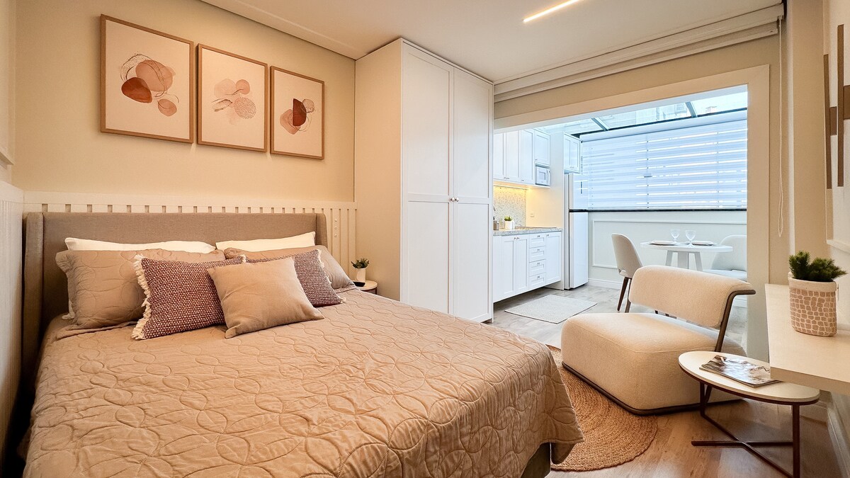Sofisticado apartamento tipo estudio ubicado a 800 metros del parque Vila Germânica, lugar de eventos como el Oktoberfest. Rodeado de restaurantes, bares y supermercados. Todo para su comodidad: Smart TV 50" Samsung, aire acondicionado split, ducha de gas, wifi fibra 240mb, cocina completa con heladera Brastemp, microondas, horno, estufa, campana extractora, cafetera, purificador de agua, lava y seca, armarios, y por supuesto ¡una cama queen con el mejor colchón!