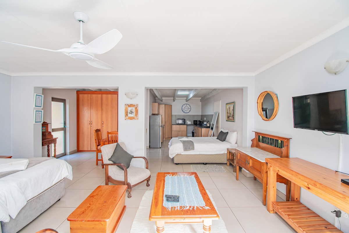 Ideal para 2 personas o una familia de 3, el apartamento con aire acondicionado está amueblado con 2 camas de 3/4 y una cama doble, un baño privado con ducha y bañera. La cocina está equipada con fogones, microondas y nevera. TV con canales seleccionados de DStv, así como acceso a wifi. Patio privado y entrada. Un hogar lejos de casa.
