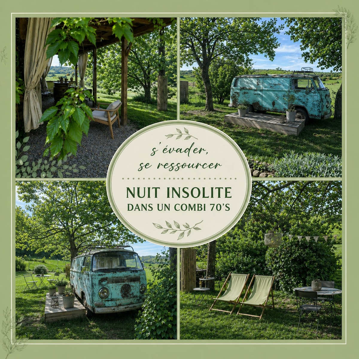 Nuit inoubliable dans notre combi Volkswagen de 1976 au milieu d'un champ avec vue époustouflante à 30' du Larzac. Au coeur de l'Aveyron à 20 ' de Saint Affrique , 30 'du Viaduc de Millau, 15 'des caves de Roquefort et 12' minutes d'une plage aménagée dans la vallée du Tarn avec une cascade. Pour un séjour sur mesure, les petits plus: -linge de lit /serviettes (20 euros pour deux) -petit déjeuner Aveyronnais (30 euros pour deux)