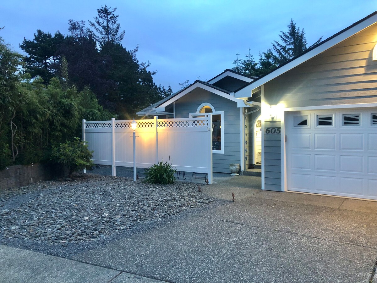 Encantadora casa al final de una cancha con un ambiente muy tranquilo y silencioso. Excelentes vistas al mar desde la terraza trasera, habitación de invitados Cal King y sillas de sala de estar. Juguetes y sillas de playa, películas y juegos de mesa están disponibles para tu disfrute. Cerca de los ríos Chetco, Winchuck, Pistol y Smith. A 1,5 millas del puerto de Brookings, Harris Beach está a menos de una milla y a poca distancia a pie de nuestra adorable calle principal con excelentes tiendas, restaurantes y bares.