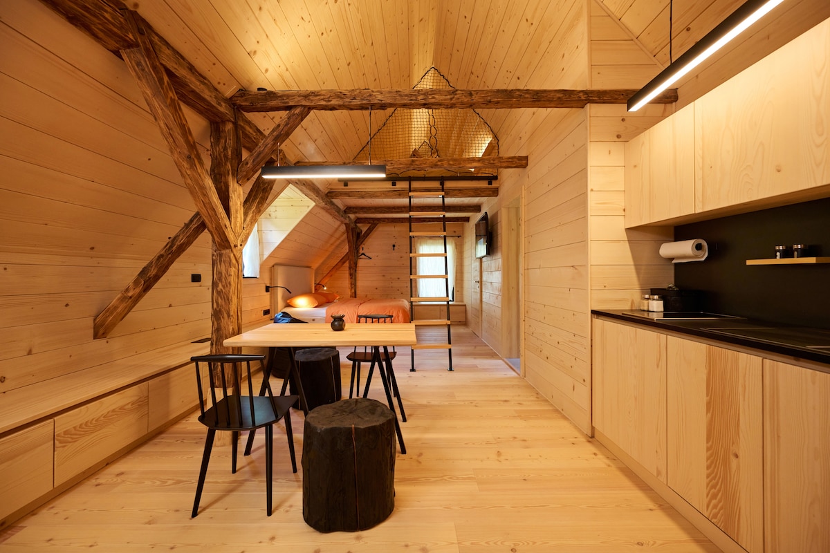 Despiértate en una cabaña construida con madera de nuestro bosque, en una ubicación idílica. Por la mañana, desde tu cama caliente, puedes mirar a través del cristal panorámico y admirar la magnífica vista de los Alpes de Kamnik-Savinja. En la cabaña hay una cama doble con una cama extra extraíble, una pequeña cocina con nevera y una terraza al aire libre con tumbona. Cada cabaña tiene su propio baño en las inmediaciones (15-30 m).