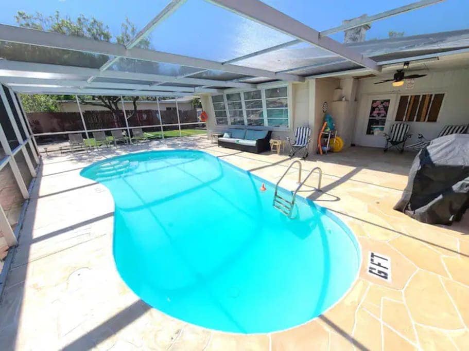 ¡Esta casa decorada de forma única cuenta con 4 dormitorios, 2 baños y una piscina climatizada por energía solar! Está a solo 7 minutos en coche de las hermosas playas de arena blanca de Inidan Shores. A menos de 15 millas hay muchas otras playas, incluida la playa número 1 de los Estados Unidos: Clearwater Beach. Hay capacidad para 9 personas, televisores inteligentes Samsung nuevos en todas las habitaciones, una piscina a nivel del suelo, un bar al aire libre y una gran sala de estar y comedor de concepto abierto. Además, el precioso sendero de Pinellas está a pocas manzanas de distancia.