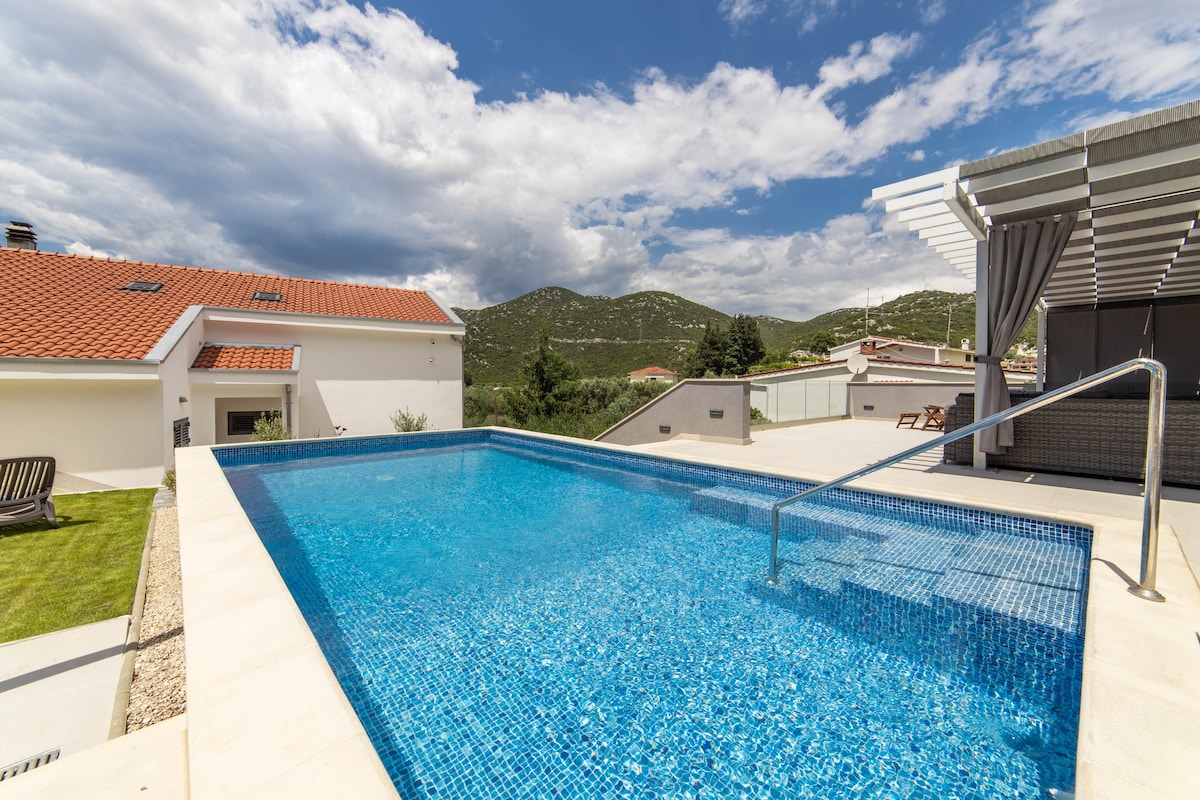 🏡 Luxury Villa Energy – Orebić 🌊 🍽️ Fully equipped kitchen 🛋️ Spacious living room –relax & unwind in comfort 🛏️ 4 en-suite double bedrooms 🚿 4 modern bathrooms –with walk-in showers 🚻 1 guest toilet –extra convenience for larger groups 🏊♀️ Heated private pool –enjoy swimming all year round 🏋️♂️ Gym/fitness area -stay active even on vacation 💛 Accommodates up to 8 guests –ideal for families or groups ✨ Perfect for a luxurious and active getaway in beautiful Orebić! 💙