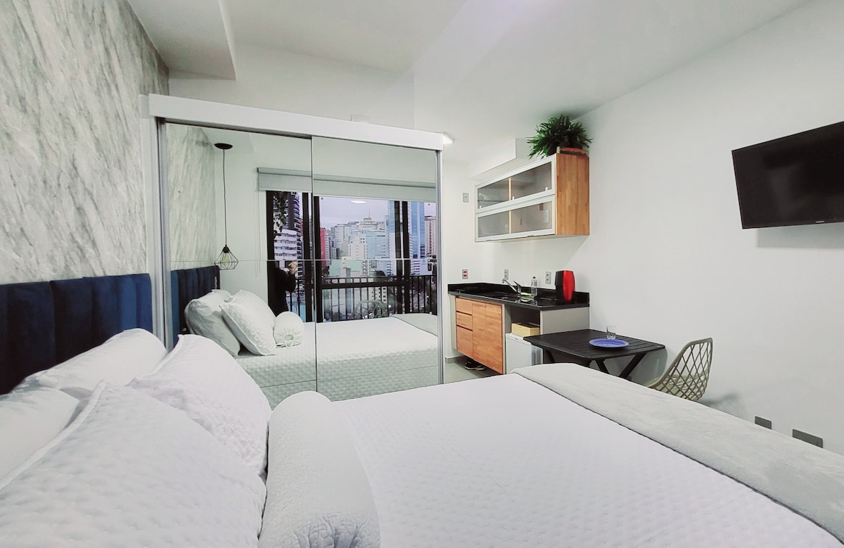 Estudio con decoración de alto estándar, ideal para estancias cortas o largas. Espacio diseñado para alojar hasta 2 personas con total comodidad. Situado en el sofisticado barrio de Moema, rodeado de calles arboladas y una amplia variedad de restaurantes de cocina internacional. Fácil acceso a farmacias, panaderías y mercados, además de estar cerca del Parque Ibirapuera y a solo 500 metros de la estación de Moema. Internet de alta velocidad (500 MB), lo que garantiza una excelente experiencia para la oficina en casa.