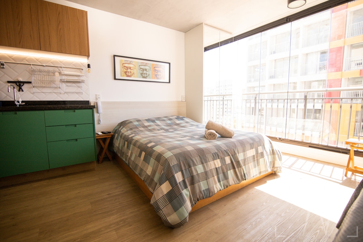 Estudio moderno en el centro de São Paulo. A 2 minutos de la estación de metro República, cerca de Terraço Itália, Copan, Sesc 24 de Maio, Galeria do Rock y Largo do Arouche, con excelentes bares y restaurantes alrededor. Dos camas individuales que se convierten en una doble, aire acondicionado. Condominio con lavandería, piscina, sauna, gimnasio, espacio de coworking, barbacoa y mercado. Se aceptan mascotas pequeñas. El aparcamiento se paga por separado. Ideal para el ocio o el trabajo.