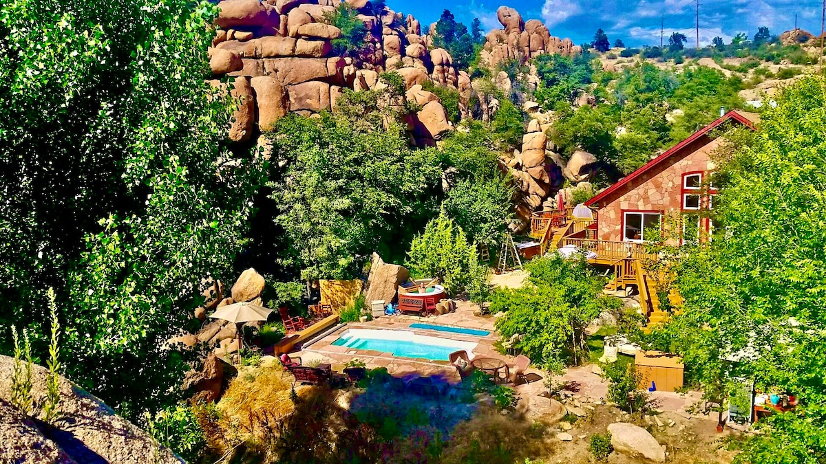 Disfruta del lujo en una propiedad de 14 acres. Disfrutará del uso exclusivo de la vivienda principal, que cuenta con 2 dormitorios y 1.5 baños, mientras que 3 dormitorios y 2 baños permanecerán cerrados y desocupados. La propiedad se comparte con una casa de huéspedes separada y un granero privado, discretamente oculto detrás de una cerca de cedro para mayor privacidad. Este refugio de diseño cuenta con muebles de alta gama, una suite principal tipo spa con chimenea, una habitación con cuatro literas, fogata, terraza de observación de 9 metros (30 pies) y una piscina vaquera de 3 metros (10 pies) con temperatura regulable bajo las estrellas.