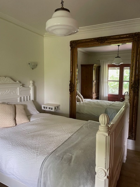 Bienvenido a nuestra renovada cabaña de troncos de 1832 en los terrenos de la plantación de George William Washington y Sarah Wright Washington del siglo XIX. La cabaña fue la primera estructura construida. Luego vinieron los graneros y las viviendas de los esclavos (que ya no existen). El granero de la lechería es ahora una tienda de carpintería y el granero del banco fue recientemente restaurado. La casa principal, construida en 1835, es de estilo neogriego. Hoy, nuestras más de 300 acres están certificadas como orgánicas. Limitamos con el brazo sur del río Potomac. ¡Es CASI EL CIELO!