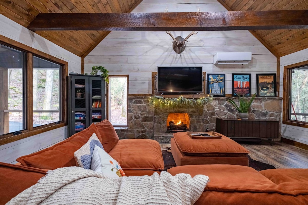 Nuestra hermosa, rústica y personalizada cabaña se encuentra a orillas de un gran lago privado. Disfruta del café de la mañana en el gran porche envolvente y observa cómo la niebla de la mañana se desprende del agua turquesa. Con cuatro dormitorios, dos baños y suficiente espacio para dormir cómodamente para diez personas, este hogar lejos de casa es perfecto para familias grandes que buscan relajarse y reconectarse con la naturaleza. La única casa en una gran parcela cerrada de terreno privado, esta cabaña es realmente una oportunidad única para escapar de todo.