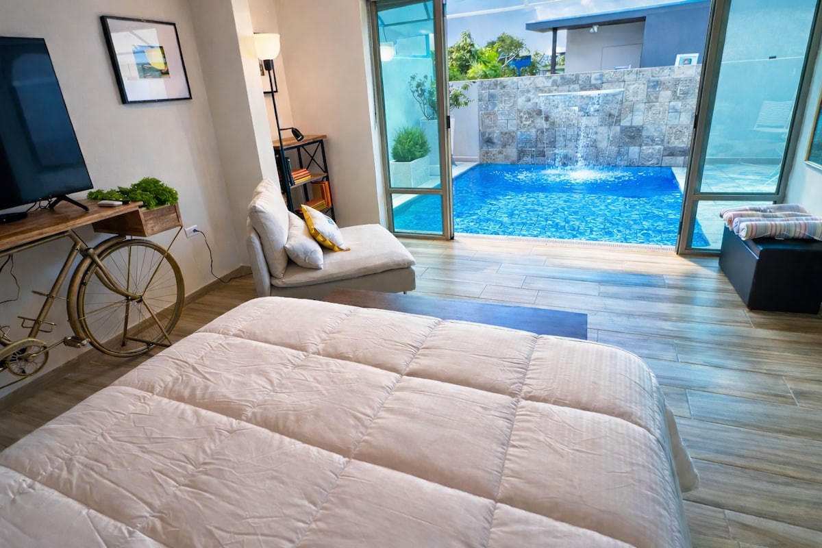 Welcome to your own private paradise! This stunning 1-bedroom house has a private pool, laundry, fully-equipped kitchen, living room, workspace, and king-sized bed bedroom by the pool. But that's not all – the interior garden provides a lush oasis to escape and unwind. Perfect for couples seeking a luxurious retreat, this home has everything you need for a comfortable and convenient stay. Located in a peaceful neighborhood, with nearby attractions, book now for the ultimate getaway experience!
