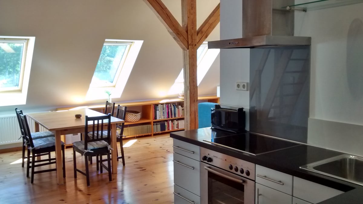 Te damos la bienvenida a esta caseta de carruajes única (90 metros cuadrados). Construido en 1922, ha sido cuidadosamente restaurado y convertido con materiales de alta calidad. Este romántico establecimiento se encuentra en las instalaciones de la villa de Potsdam, a orillas del Jungfernsee, y cuenta con árboles frutales y nogales antiguos. En verano, se puede disfrutar de un baño en el lago antes del desayuno, si lo desea. A solo un tiro de piedra del mundialmente famoso puente Glienicke. Durante décadas durante la Guerra Fría, el puente fue el lugar donde se intercambiaron espías.