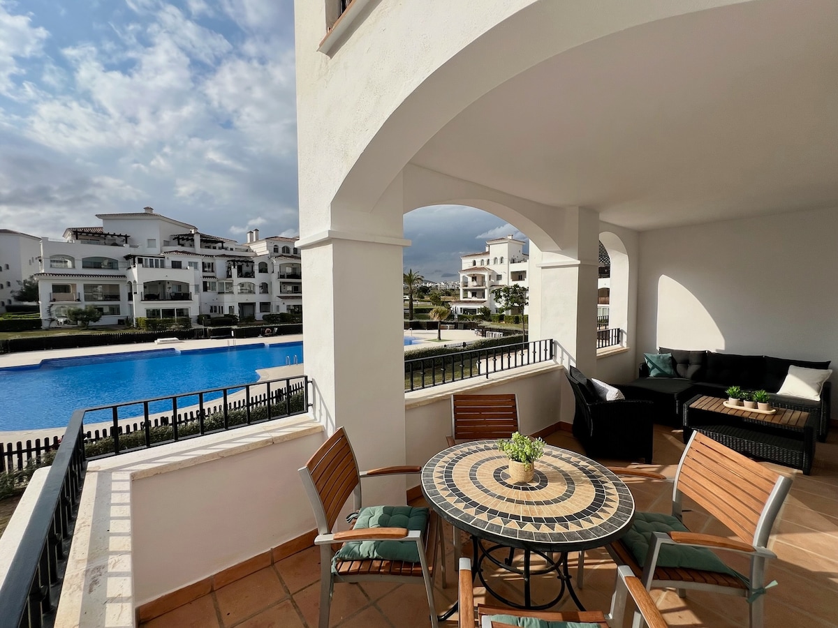 Crearás muchos recuerdos nuevos en este lugar único para las familias. Gran apartamento totalmente equipado con una gran terraza y hermosas vistas a la piscina y al campo de golf. Cocina totalmente equipada (nevera, congelador, cafetera, tostadora, lavavajillas, horno, microondas, lavadora). 1 baño, 2 dormitorios, ambos equipados con camas tamaño king y armarios empotrados. Las mejores playas de la Costa Blanca y la Costa Calida a solo 20 minutos del centro vacacional. Aeropuerto de Alicante a 50 minutos en auto.