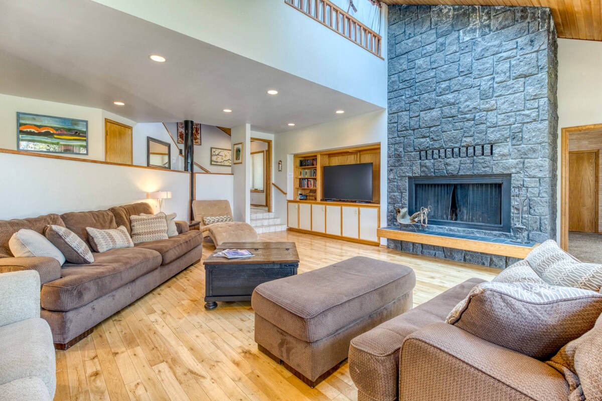 Esta lujosa casa de 5 Fawn Lane tiene una ubicación céntrica y está a solo 7 minutos a pie del Village at Sunriver. Un sendero para caminar/montar en bicicleta a 25 pies detrás de la cochera conduce directamente al centro comercial y al Sunriver Resort. Equipado con muebles de lujo, tragaluces y ventanales que dan a la sala de estar una sensación de luz y apertura con una amplia zona común alrededor de la casa que proporciona privacidad y apertura. Incluye chimenea de gas, aire acondicionado central, cargador de vehículos eléctricos y pases SHARC. La casa tiene capacidad para alojar cómodamente a 14 huéspedes.