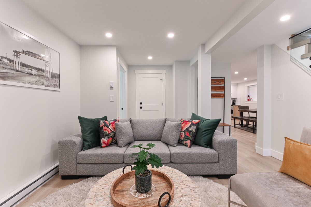 Una suite espaciosa con un hermoso jardín que cuenta con cocina completa, área de comedor y sala de estar de concepto abierto y un baño privado. Duerme bien en una cama tamaño queen con sábanas blancas y almohadas celestiales. Disfrute de wifi gratuito, vea sus películas favoritas de Netflix en un televisor enorme y relájese junto a una cálida chimenea eléctrica. ¡El café de la mañana y las botellas de agua son de cortesía! Ubicado en un barrio tranquilo con estacionamiento gratuito. A 20 minutos en auto desde/hacia la terminal de ferry de Tsawwassen. A 30 minutos en auto desde/hacia el aeropuerto YVR.