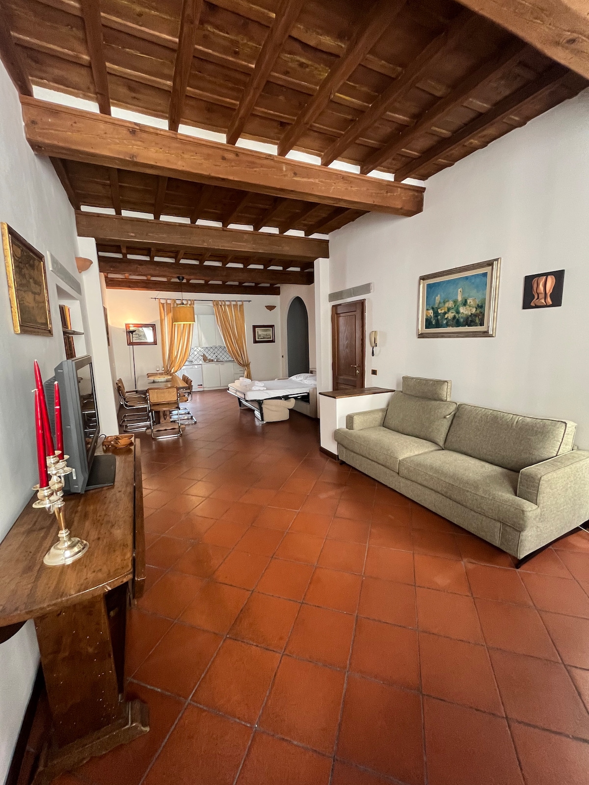 El apartamento representa la combinación perfecta entre belleza y comodidad italiana. Está elegantemente amueblado en estilo florentino, con techos altos y vigas de madera. Además, su toque moderno lo hace agradablemente funcional: equipado con TV, Internet wifi, aire acondicionado, calefacción, cocina totalmente equipada, sábanas y toallas incluidas. Si miras por la ventana, puedes ver la cúpula de la catedral de Florencia.