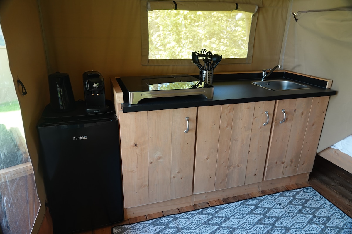 Disfruta de los sonidos de la naturaleza cuando te hospedes en este lugar único. Desde la tienda se puede contemplar los campos y las rosas silvestres. Además de 2 adultos, pueden alojarse 3 niños. Duermen en un colchón para niños en el suelo. Cuando haga calor, abre todas las ventanas para que la tienda se ventile. También tienes una nevera, cafetera de filtro, hervidor de agua, cocina de gas con 3 fuegos, platos, tazas y cubiertos, barbacoa, cesta de fuego. Wifi gratuito en el edificio sanitario.