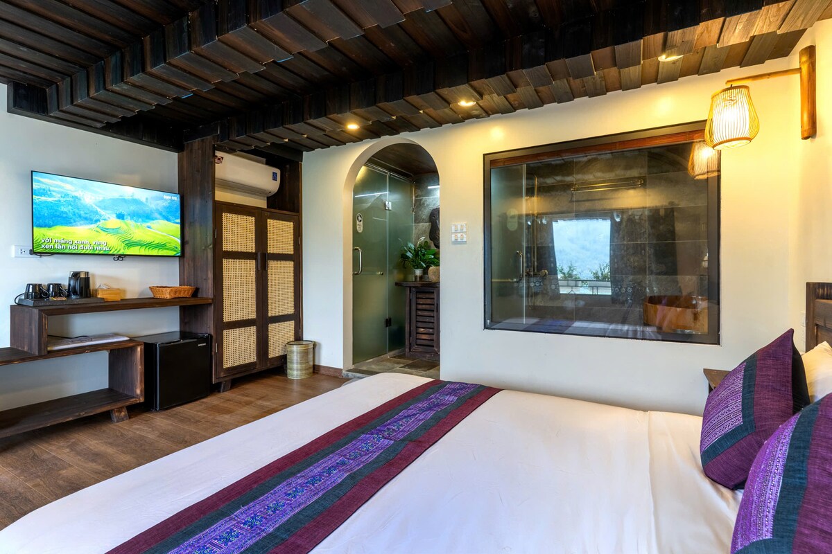 Bienvenido a nuestro encantador bungalow, donde puedes despertar con una de las vistas más impresionantes de los campos de arroz en terrazas en Sapa. Con grandes ventanales de vidrio, nuestra acogedora habitación ofrece un panorama ininterrumpido, lo que te permite sumergirte en la belleza de la naturaleza. El sereno amanecer desde tu cama hará que tu estadía sea realmente inolvidable. ¡Ven y experimenta la mezcla perfecta de comodidad y paisajes impresionantes en nuestro refugio en la ladera!