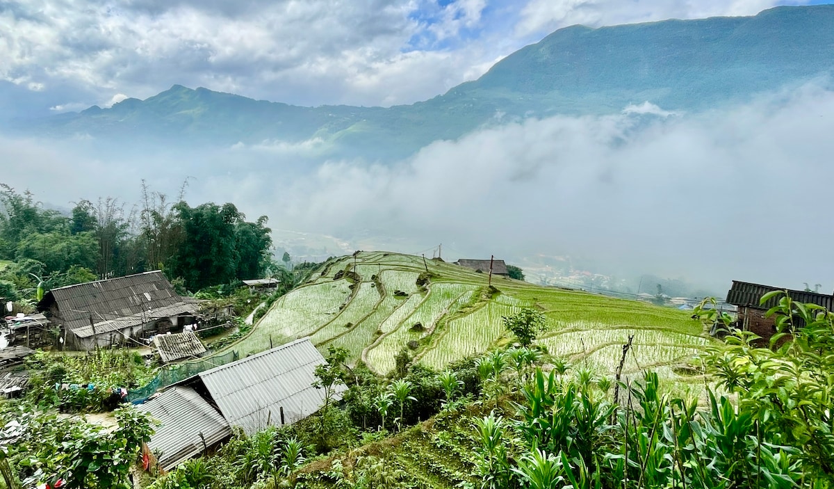 Relájate en esta escapada única y tranquila. La casa tiene una vista de 180 grados de todo el valle de Muong Hoa, viendo los campos en terrazas, viendo las montañas Fansipan, viendo las nubes que rodean el valle. Los anfitriones viven en la casa y están dispuestos a ayudar a los huéspedes cuando sea necesario.