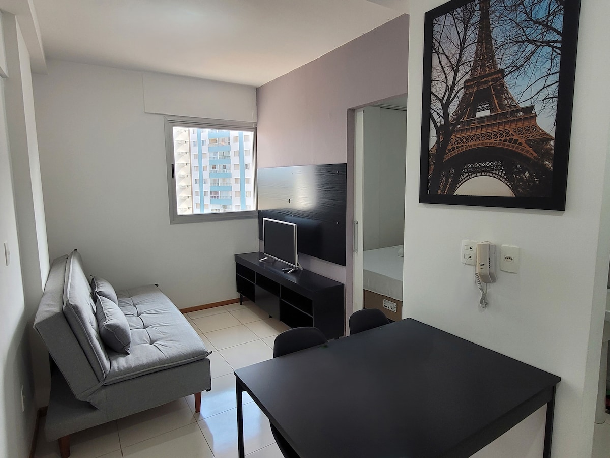 Un apartamento de 37 m², muy funcional y elegante, en Águas Claras, el barrio más nuevo y vibrante de Brasilia. Olvídate del coche y usa el moderno metro para viajar a los puntos principales de Brasilia. 🔺 2 aires acondicionados 🔺 Cama doble en el dormitorio 🔺 Cómodo sofá cama en el salón, con persianas Lavadora🔺 /secadora Televisión 🔺inteligente de 55" en el salón y otra de 42" en el dormitorio 🔺 2 piscinas 🔺 gimnasio 🔺 Gran área para caminar/trotar