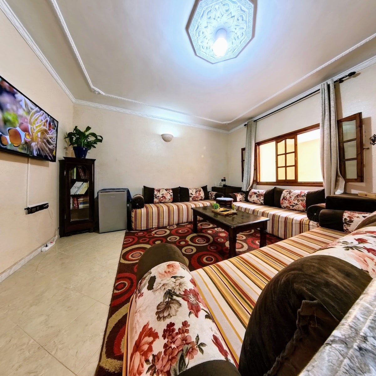 Bienvenido a tu pedacito de Marruecos auténtico, ¡donde el encanto tradicional se une al paraíso de los surfistas! 🏄♂️ Nuestra suite junto a la playa, con muy buenas valoraciones, ofrece la combinación perfecta de estilo local y comodidad moderna. 🏠 Tu espacio privado: • 2 dormitorios cómodos. • Salón tradicional marroquí con Smart TV. • Baño privado completo. • Wifi rápido (108 Mbps). Paraíso 🌅 compartido en la azotea: • Cocina totalmente equipada para uso de los huéspedes. • Impresionantes vistas al mar y a las montañas. • Asientos relajantes en la terraza. • Lugar perfecto para ver el atardecer.