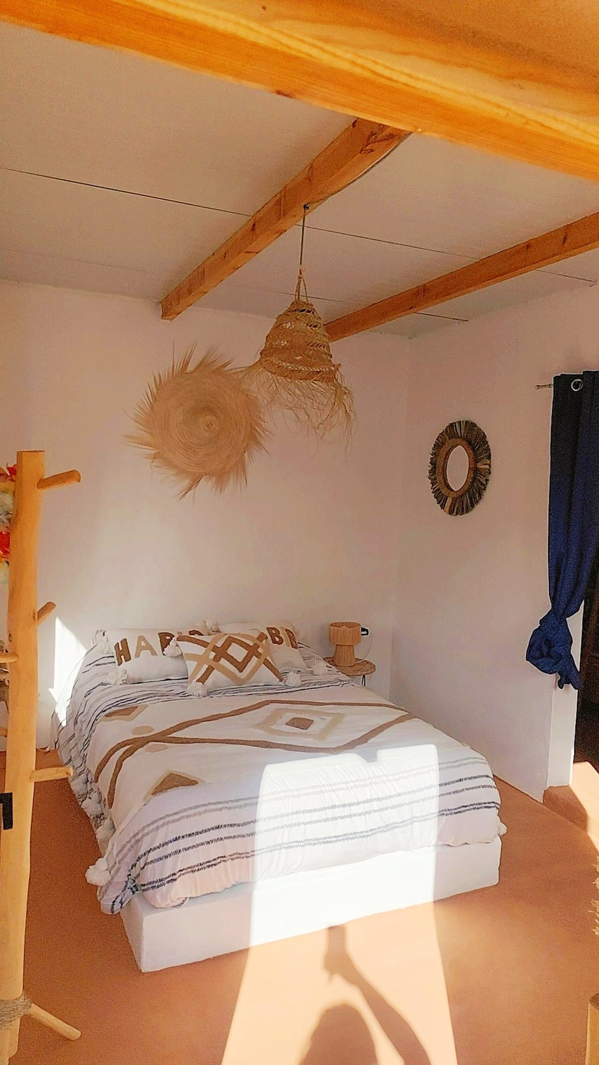 Welcome to our cozy traditional wooden studio, just minutes from the beautiful beaches of Tamraght and Taghazout. Perfect for two, it offers two single beds and warm, authentic decor inspired by southern Morocco. Stay with us in a friendly guesthouse, relax on the terrace, and join daily surf lessons nearby. Explore local gems like the Timlalin dunes, Souk El Had market, and Paradise Valley. Experience calm, culture, and surf all in one place.