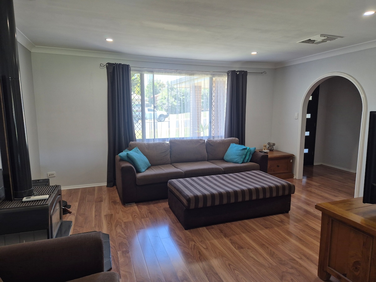 Kurrajong Lodge es una casa moderna y espaciosa en un acre de césped en un entorno semirural tranquilo. Disfruta de una piscina de agua salada espumosa exclusivamente tuya y cuatro dormitorios recién alfombrados (a partir de julio de 2022), cada uno con su propio aire acondicionado de sistema dividido. Con una acogedora chimenea de gas, seis sistemas de aire acondicionado y refrigeración por evaporación, la comodidad está garantizada durante todo el año. A pocos minutos del vibrante corazón de Tamworth, esta lujosa casa ofrece la escapada perfecta. Nota: No se permiten fiestas.