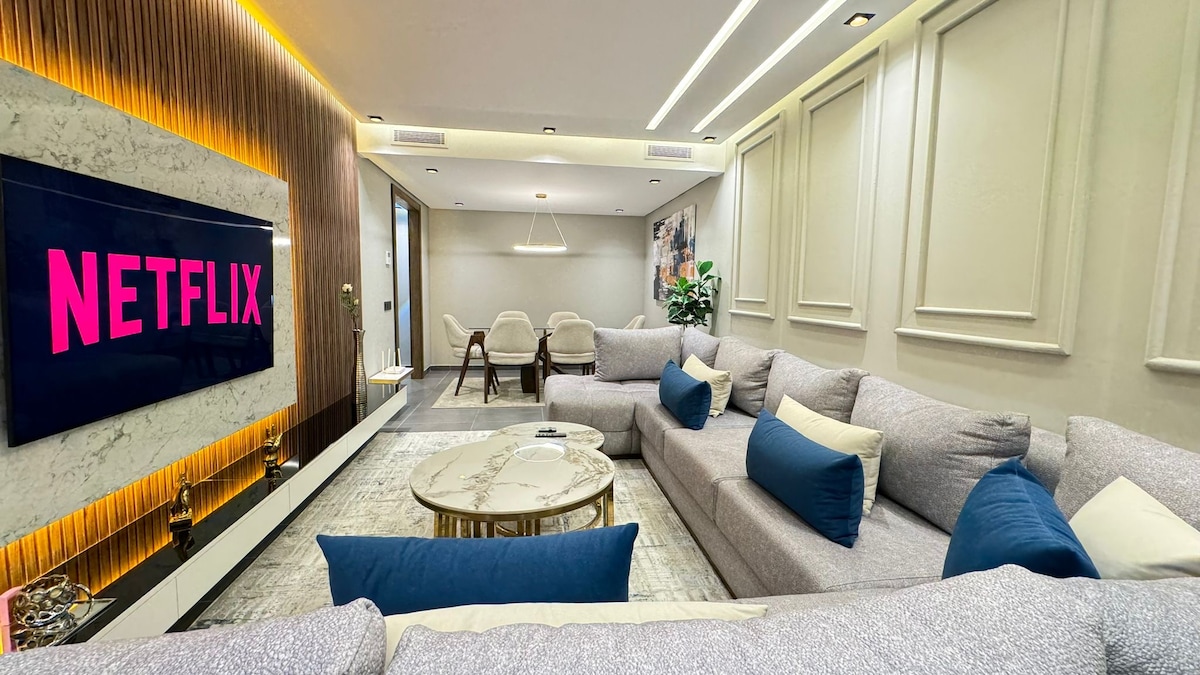 Disfruta de la comodidad de 5 estrellas en esta elegante suite de 3 dormitorios en el último piso en el corazón de Tánger 🌊 Impresionantes vistas a la ciudad y al mar, diseño estilo Hilton y espacio para hasta 6 huéspedes. Disfruta de aire acondicionado central, una cocina totalmente equipada, wifi rápido y estacionamiento privado en el lugar 🅿️ para una estadía sin estrés. A pocos pasos del centro comercial de Tánger, la playa y la estación de TGV 🚆, ideal para escapadas familiares, escapadas románticas, viajes de negocios o escapadas de fin de semana explorando el vibrante norte de Marruecos y su costa.