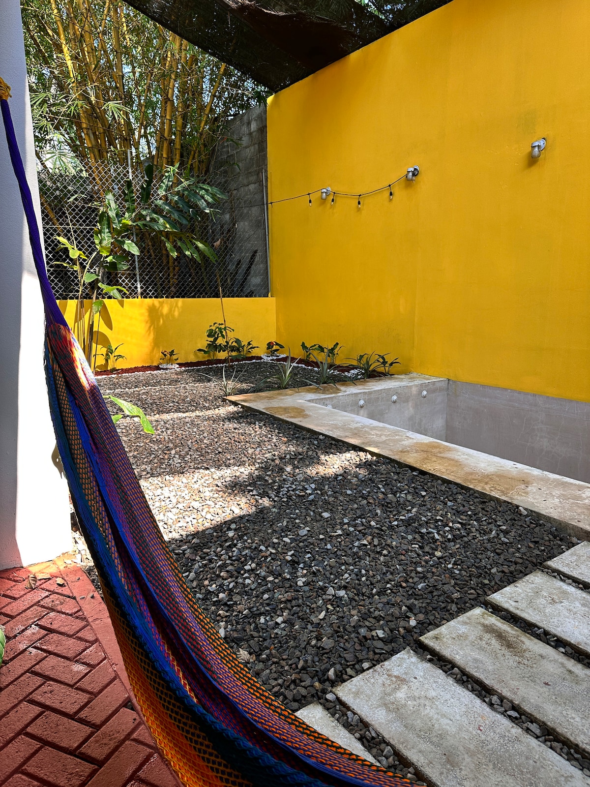 Desconecta de tus preocupaciones en este espacio tan amplio y sereno, en un hermoso jardín con árbol de mango y otros árboles frutales, asador, sillas para tus reuniones familiares. Casa de dos habitaciones con aire acondicionado, dos baños completos.