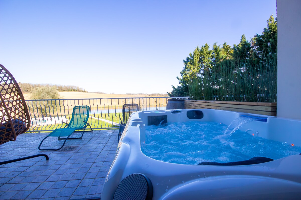 Venga a descubrir para una estancia larga o corta nuestro remanso de paz y serenidad en un alojamiento totalmente equipado y su terraza privada. Pase un momento de relajación con su bañera de hidromasaje, ducha a ras de suelo, e incluso viaje en la habitación con sus impresionantes vistas de las colinas de Lauragais. También cuenta con un sofá cama convertible. Cocina equipada. Recargar las pilas un momento en la naturaleza con hermosos paseos con vistas a los Pirineos.