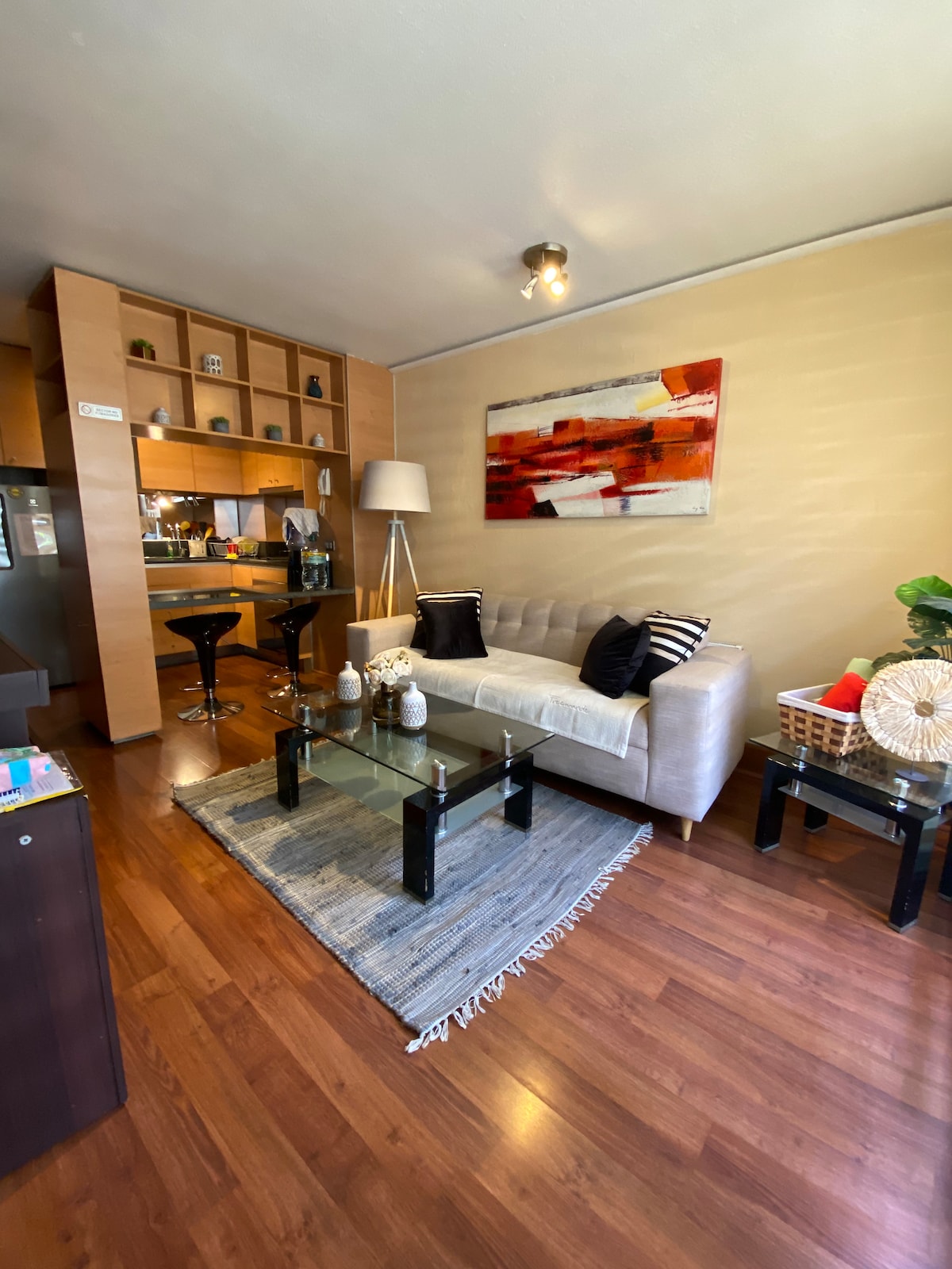 Amplio y luminoso departamento en el corazón de Santiago 🌆. Ideal para viajeros que buscan comodidad, independencia y una gran vista a la ciudad. Con diseño cálido y funcional, ofrece Wi-Fi rápido, Smart TV y cocina equipada. Somos un alojamiento sustentable, fomentamos el uso de transporte público y reciclamos. Ubicado cerca del metro, cafés, museos y atractivos turísticos para disfrutar Santiago a pie con total confort.