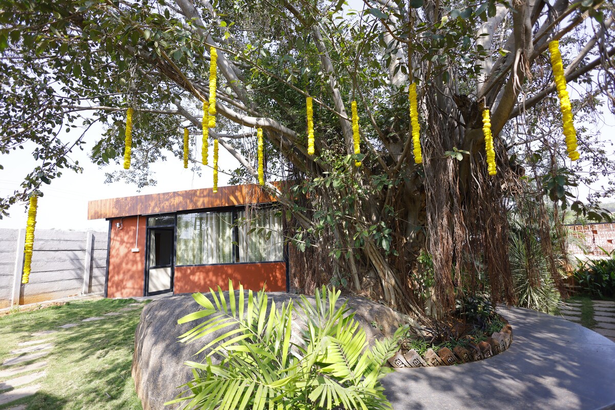 Bienvenido a The Airport Villa, una exclusiva casa de lujo de 2 dormitorios con aire acondicionado completo, ubicada en Shamshabad, cerca de la NH-44. Perfecto para familias, estancias corporativas, eventos privados y rodajes de películas. No se permiten reservas para parejas no casadas o grupos mixtos. Los huéspedes pueden disfrutar de una conexión wifi rápida, tranquilos espacios al aire libre con teca y elegantes interiores. Un dócil pastor alemán de 5 años también vive en la propiedad en una casa separada.