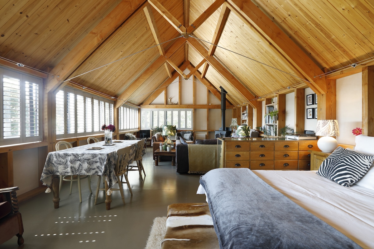 El granero está en los terrenos de nuestra casa del siglo XV, pero muy privado. Está decorado en estilo rústico moderno, con calefacción por suelo radiante y una estufa de leña. En el exterior hay un pozo para hacer fogatas para asar nubes de azúcar y observar las estrellas antes de meterse en la cama tamaño king, vestida con suave algodón egipcio. Hay una ducha de efecto lluvia, albornoces, libros, DVD, juegos, wifi y un televisor inteligente. Aléjate para explorar bosques, jardines, viñedos, castillos y casas del National Trust.