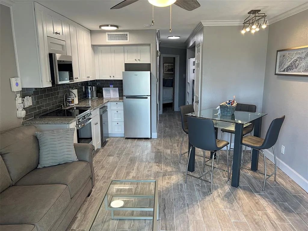 • Condominio de lujo en el primer piso: remodelado con impresionantes vistas parciales al Golfo desde un gran balcón. - Espaciosa 475 pies cuadrados.: nuevos pisos de baldosas de porcelana y acabados modernos. • Literas personalizadas: con puertos USB para mayor comodidad. • Cocina totalmente renovada: gabinetes nuevos y electrodomésticos de tamaño completo para cenar fácilmente. - Baño: incluye una bañera de ducha para relajarse. • Entretenimiento: TV inteligente de 65 pulgadas en el salón y TV inteligente en el dormitorio. • Retiro costero ideal: ¡diseñado para la comodidad y el estilo!